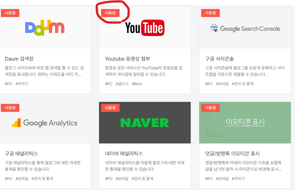 좌측 플러그인을 클릭하면 유튜브 아이콘이 들어있는 박스가 보이고 여기 들어가 하단의 ‘적용’만 누르면 설정은 완료되고 그림처럼 사용중으로 표시된다.