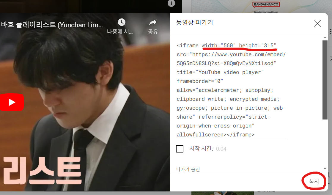 앞서 설명한 유튜브 영상의 ‘공유’를 클릭하면 ‘퍼가기’라는 버튼이 있고 좌측에 뜨는 HTML 코드를 복사해 두면 된다.